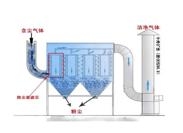 采用在线喷吹模式,利用低压中风量脉冲压缩空气清灰。当含尘烟气由进风口进入灰斗后,一部分较粗尘粒在这里由于惯性碰撞、自然沉降等原因落入灰斗,大部分尘粒随气流上升进入袋室,经滤袋过滤后,尘粒被阻留在滤袋外侧,净化的烟气由滤袋内部进入箱体,再由净气室、出风口排入大气,达到除尘的目的。