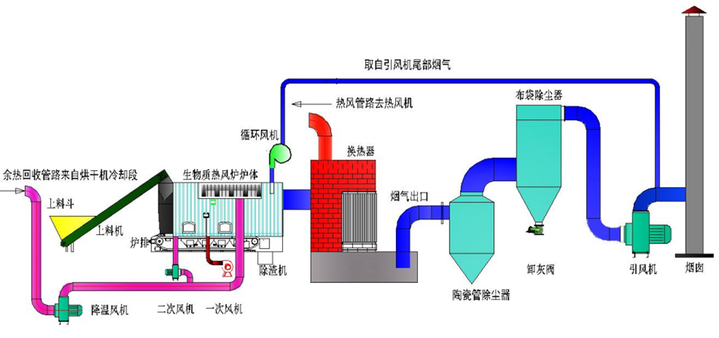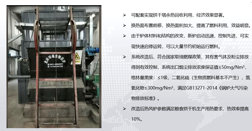全钢生物质热风炉系统主要作为粮谷干燥设备的热源装置,其结构设计合理,热效率高,适用于各种粮食烘干机。热风炉系统主要包括燃烧装置、换热装置、环保节能装置三部分组成。